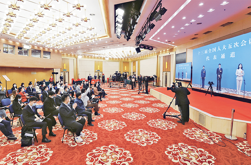 倾听人民心声,筑牢民主基石。2022年3月8日,第十三届全国人民代表大会第五次会议举行第二场“代表通道”采访活动。这是记者在分会场通过网络视频方式采访。 新华社记者 殷刚/摄