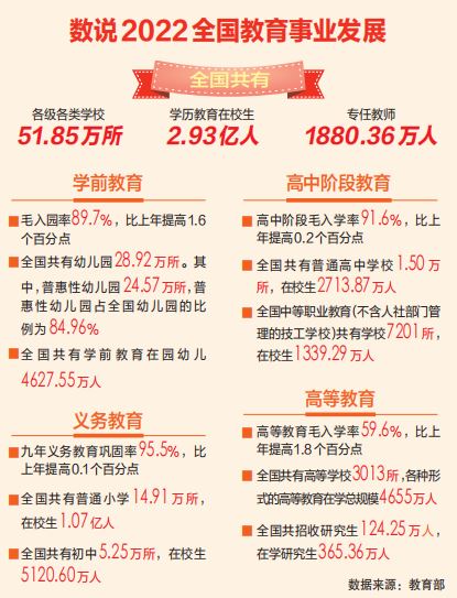 ■聚焦点·教育部新闻发布会 本报北京3月23日讯(记者 欧媚 程旭)教育部今天召开新闻发布会,介绍2022年我国教育事业发展基本情况。教育部发展规划司司长刘昌亚在发布会上介绍,2022年全国共有各级各类学校51.85万所;学历教育在校生2.93亿人,专任教师1880.36万人。新增劳动力平均受教育年限达14年。 2022年,学前教育普惠资源进一步增加。2022年,学前教育毛入园率89.7%,比上年提高1.6个百分点。全国共有幼儿园28.92万所,学前教育在园幼儿4627.55万人。其中,普惠性幼儿园24.57万所,普惠性幼儿园占全国幼儿园的比例为84.96%;普惠性幼儿园在园幼儿4144.05万人,占全国在园幼儿的比例为89.55%,比上年增长1.77个百分点。 义务教育办学条件进一步改善。2022年,九年义务教育巩固率95.5%,比上年提高0.1个百分点。其中,全国共有普通小学14.91万所。全国小学招生1701.39万人,在校生1.07亿人。全国小学阶段教育56人及以上的大班1.38万个,比上年减少0.72万个,大班占总班数的比例为0.48%,比上年下降0.25个百分点。全国共有初中5.25万所。全国初中招生1731.38万人,在校生5120.60万人。全国初中56人及以上的大班4522个,比上年减少2703个,大班占总班数的比例为0.40%,比上年下降0.25个百分点。 高中阶段教育普及水平进一步提高。2022年,高中阶段毛入学率91.6%,比上年提高0.2个百分点。其中,全国共有普通高中学校1.50万所,比上年增加441所;招生947.54万人,比上年增长4.71%;在校生2713.87万人,比上年增长4.18%。全国中等职业教育(不含人社部门管理的技工学校)共有学校7201所,比上年减少93所;招生484.78万人,比上年下降0.86%;在校生1339.29万人,比上年增长2.09%。 高等教育在学规模进一步扩大。2022年,高等教育毛入学率59.6%,比上年提高1.8个百分点。全国共有高等学校3013所。各种形式的高等教育在学总规模4655万人,比上年增加225万人。全国普通、职业本专科共招生1014.54万人,比上年增长6.11%。全国共招收研究生124.25万人,比上年增长5.61%。 特殊教育体系进一步完善。2022年,全国共有特殊教育学校2314所,比上年增长1.14%。全国共招收各种形式的特殊教育学生14.63万人,在校生91.85万人。民办教育结构进一步优化。2022年,全国共有各级各类民办学校17.83万所,占全国学校总数的比例为34.37%;在校生5282.72万人,占全国在校生总数的比例为18.05%。