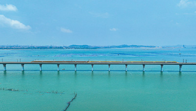 图为6月28日,福厦高铁湄洲湾跨海大桥,试验列车交会运行。 |